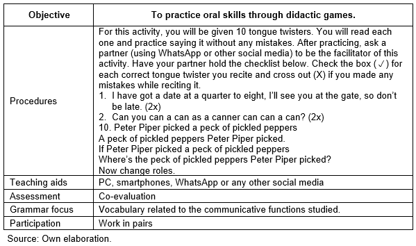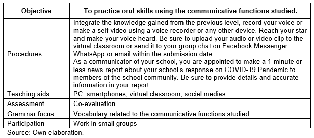 On the basis of the above, a set of learning tasks for the development of oral expression skills in English through distance learning has been elaborated for 2.nd year medical students, corresponding to the peculiarities of this age group, in order to achieve constant motivation and the proposed objectives; a sample can be observed in Table 1, 2 and 3.