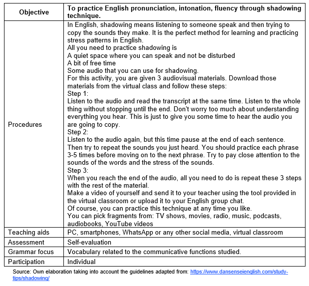 In the case of this research, the use of these resources is related to learning a foreign language: English, specifically oral proficiency, which is defined as the linguistic skill involved in producing oral discourse. It is a communicative skill that includes not only the pronunciation, vocabulary and grammar of the target language, but also sociocultural and pragmatic knowledge. It consists of a series of micro-skills, such as providing information and opinions, showing agreement and disagreement, resolving conversational errors, or knowing when it is appropriate to speak and when it is not. 3 The advantages of distance learning to ensure the acquisition of knowledge inside and outside the university environment are a good alternative in the current context, where work overload and the complexities of modern life make face-to-face access to traditional classrooms difficult. In this sense, Information and Communication Technologies (ICTs) are a basic element for achieving these targets. 4