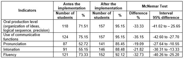 Documentary analysis: with the aim of obtaining relevant information on the current level of oral expression in English, the critical analysis of the curriculum and programs of the discipline, to analyze the information related to aspects of the teaching-learning process of English in medicine. Survey of students: In order to determine their criteria regarding the use of technologies and the modality of distance education in learning English, the requested items were evaluated according to professional criteria. Interview with the teachers of the subject: to analyze the form and the treatment of the oral expression in the career; it contributed novel elements related to the shortcomings, needs and expectations of the students around the already existing texts and exercises and on the new ones proposed. Statistical Methods: The McNemar test was used to analyze the results of the instruments used. Workshops of critical opinion and collective construction: with the aim of confirming the relevance of the proposal and redirecting the actions for its improvement, 17 English teachers with a wide experience in higher medical education of around 15 years were selected; 9 hold the scientific category of Master's Degree in Educational Sciences and Medical Education.