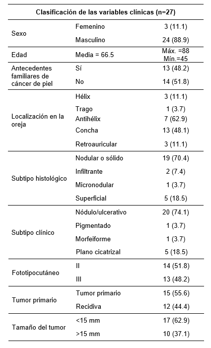 Del total de pacientes incluidos 24 fueron del sexo masculino (88.9 %); el rango de edad estuvo entre los 45 y 88 años, el 44.4 % de los casos recibieron tratamiento previo, siendo la cirugía el proceder más frecuente, la localización más común del tumor en la oreja fue la concha con 48,1 %, el subtipo histológico que predominó fue el nodular o sólido con 70.4 % y subtipo clínico el nódulo ulcerativo para un 74.1 %. La mayoría de las lesiones fueron menor de 15 mm (62.9 %).