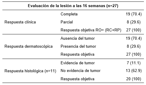 La evaluación final se realizó a las 16 semanas de tratamiento teniendo en cuenta la clínica, la dermatoscopia y la histología para medir la respuesta a la terapéutica.