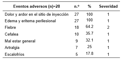 Los eventos adversos observados durante la administración del HeberFERON, fueron el dolor, ardor en el sitio de inyección, edema y eritema perilesional (100 %), la fiebre (38.5 %) y otros menos frecuentes. Todos los eventos adversos fueron no graves y la intensidad grado 1 y 2 (bien tolerado que no interfiere con las actividades cotidianas y no interrumpe la administración del producto). (Tabla 3)