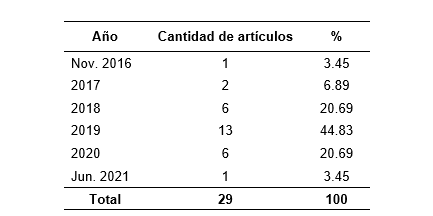 La tabla 1 muestra la cantidad de artículos encontrados y el año de mayor producción científica.