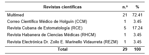 La mayor cantidad de publicaciones se realizaron en Multimed revista médica de Granma y en la Revista Cubana de Estomatología. (Tabla 2)