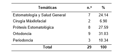 Las temáticas que más se publicaron fueron Estomatología y Salud General, Ortodoncia y Prótesis Estomatológica. (Tabla 4)