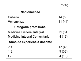 De los 25 vicecoordinadores docentes, 14 son de nacionalidad cubana (56 %) y 11 venezolanos (44 %). El 84 % (21) especialistas en Medicina General Integral y 4 (16 %) tienen más de 2 años de experiencia docente. (Tabla 1)