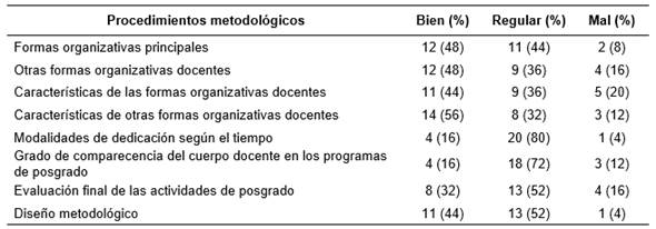De los 25 encuestados 12 (48 %) tenían una buena preparación tanto respecto a las formas organizativas principales de la superación profesional como a las secundarias (Otras formas organizativas docentes); mientras que 11 (44 %) y 9 (36 %) mostraron una preparación regular respectivamente. En el caso de las características de las formas organizativas docentes principales se observaron con buena preparación 11 (44 %) y con regular 9 (36 %). Sobre las modalidades de dedicación según el tiempo, en las actividades de posgrado, 20 (80 %) obtuvieron evaluación de regular, mientras que 4 (16 %) resultaron evaluados de bien. Respecto al grado de comparecencia del cuerpo docente en los programas de posgrado, solo 4 (16 %) fueron evaluados de bien, el resto de regular (18; 72 %) y mal (3; 12 %). En la evaluación final de las actividades de posgrado, 13 (52 %) fueron evaluados de regular y 8 (32 %) de bien. Las respuestas acerca del diseño metodológico de las actividades de superación profesional, mostraron que 13 (52 %) recibieron evaluación de regular y 11 (44 %) de bien. (Tabla 2)