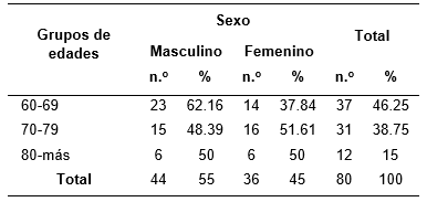 El grupo de edad más representado fue el de 60-69 años (46.25 %), y el sexo masculino el que predominó (55.0 %). (Tabla 1)