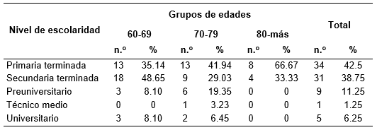En cuanto a la escolaridad se observa que a medida que aumenta la edad el nivel de escolaridad es más bajo lo que concuerda con los resultados de las encuestas nacionales de envejecimiento de la población cubana, pero se puede sugerir que a medida que transcurra el tiempo, las personas que integren el grupo de 80 años y más, van a tener un mayor nivel de instrucción que en la actualidad, teniendo en cuenta que las cohortes que van ingresando a este grupo han tenido mayores y mejores oportunidades de estudio, así como los avances tecnológicos al alcance de los medios educativos.