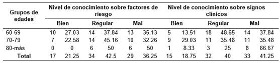 En cuanto a la relación existente entre los grupos de edades y el nivel de conocimiento sobre factores de riesgo, signos clínicos, autoexamen bucal y conducta a seguir se identificó un nivel más bajo de conocimiento en el grupo de 80 y más.