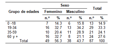 El estudio reveló que la mayor cantidad de pacientes afectados estuvo representada por el grupo de 19-34 años de edad con 29 (33.3 %), seguido del grupo de 60 y más años con 24 (27.6 %) y la mayor cantidad de ellos estuvo representada por el sexo femenino con 49 (56.3 %). (Tabla 1)