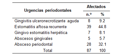 Conclusiones: La estomatitis aftosa, seguida del absceso periodontal fueron las urgencias periodontales más frecuentes en el estudio.