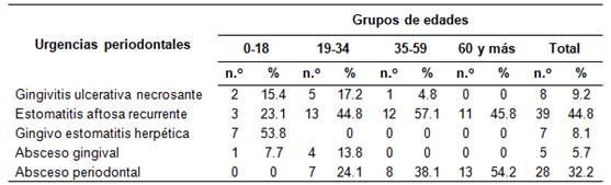 La estomatitis aftosa, seguida del absceso periodontal, fueron las urgencias periodontales más frecuentes en el estudio, con mayor afectación del sexo femenino y el grupo de 19 a 34 años de edad.