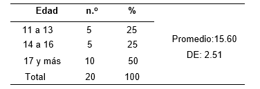 Al caracterizar el grupo de pacientes seleccionados para el estudio, se identificó un promedio de edad de 15.6 con una desviación estándar de 2.51. (Tabla 1)