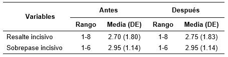 En la tabla 3 se constata la evaluación de las variables morfológicas clínicas. El valor medio de resalte incisivo al iniciar la contención fue de 2.70 mm y al finalizar fue de 2.75 mm. Esta ligera diferencia no tiene repercusión clínica, ya que se mantuvo dentro de los rangos funcionales (entre 0 y 4 mm para la dentición permanente).