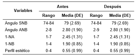 Los valores obtenidos en la medición de los ángulos SNB y ANB, se mantuvieron inalterables durante el uso del aparato, lo que demuestra que la mandíbula mantuvo su posición en sentido anteroposterior con respecto a la base del cráneo y en su relación con el maxilar. Los valores del perfil estético son indicativos de la contención lograda, que expresan una compensación entre las bases óseas, la posición de los dientes y los tejidos blandos del paciente. Similares resultados se obtuvieron en estudio realizado por Gómez SL, et al., 8 al evaluar la efectividad de la estabilidad dentaria y oclusal con dos tipos de aparatos retenedores.