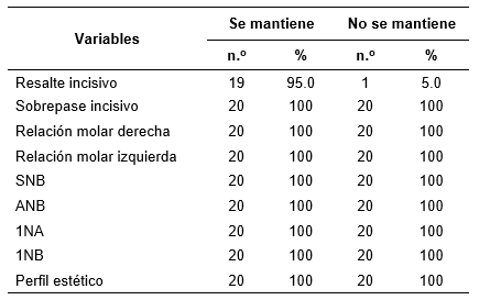 Resultados: Se constató una edad promedio de 15.6; el 65 % de los escolares pertenecían al sexo femenino. Al año de iniciada la contención se mantuvo el sobrepase incisivo en 2.95 mm, la relación molar de neutroclusión en el 65 %, ángulo SNB en 79°, el ángulo ANB en 2.80°, la posición del incisivo superior 2.45 mm, la posición del incisivo inferior en 1.90 mm y el perfil estético en 0.55 mm. Solo existió incremento en el valor promedio del resalte incisivo de 2.70 mm a 2.75 mm.