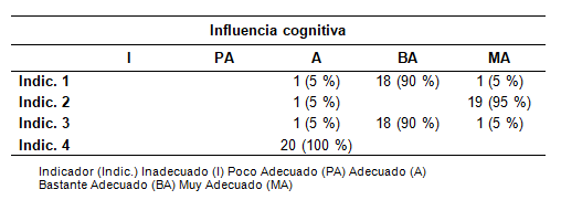 En el caso de la dimensión influencia cognitiva (Tabla 1), los indicadores 1 y 3 fueron catalogados de bastante adecuados 18 especialistas (90 %) que dando repartido los restantes valores entre muy adecuado y adecuado 1 especialista (5 %) respectivamente, primando el criterio de que se incluyen contenidos claves para desarrollar una práctica deportiva inclusiva, como son: escolares en situación de discapacidad, atención educativa a la diversidad, diferencias individuales e inclusión educativa todos en el contexto del Deporte para Todos. Así mismo, consideran de una manera B.A que las actividades activan el conocimiento con el uso de medios alternativos, elaborados a partir de los recursos familiares, la comunidad y del entorno natural y mejoran además la salud de los escolares.