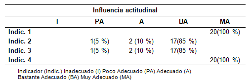 Como refleja la tabla 2, las valoraciones más altas fueron otorgadas a los indicadores 1 y 4, donde 20 (100 %) de los especialistas lo consideran como muy adecuada por la influencia sobre la motivación hacia la superación profesional, y la posibilidad que ofrecen sus contenidos de enfrentar los problemas existentes en la práctica educativa.