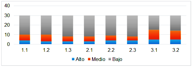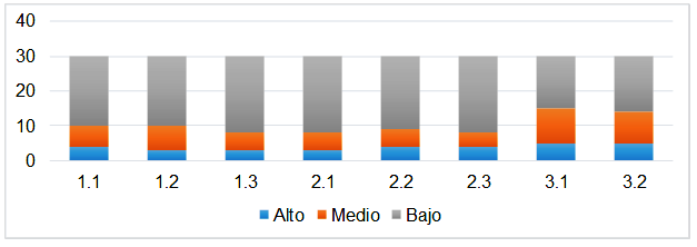 Los indicadores fueron evaluados a partir de la matriz de valoración elaborada, que utilizó las categorías Alto (A), Medio (M) y Bajo (B).