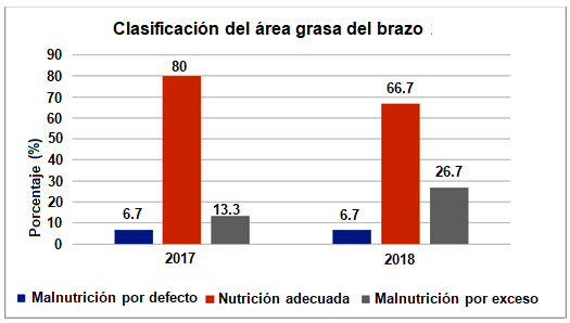 En ambas estimaciones de 2017 y 2018, el 6.7 % de los campesinos presentó malnutrición por defecto y el 93.3 % nutrición adecuada, atendiendo al área muscular del brazo. En relación con el área grasa del brazo también predomina la normalidad, aunque se evidencia en la figura 1 un ligero aumento en 2018 de individuos con malnutrición por exceso.