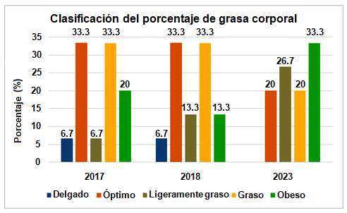Se observan en la figura 2 las clasificaciones del porcentaje de grasa corporal en los 3 años estudiados. Entre 2017 y 2018, un solo individuo bajó de la categoría de obeso a ligeramente graso. Sin embargo, destaca el aumento general de adiposidad en 2023 pues no se reportó ni un sujeto delgado, disminuyen los campesinos con valor óptimo de grasa corporal y se incrementan los ligeramente grasos y obesos en relación con las fechas anteriores.