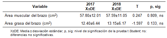 Resultados: En las 2 estimaciones predominó la nutrición adecuada según el área muscular y grasa del brazo. Disminuyeron los pliegues cutáneos y la adiposidad en 2018 respecto a 2017 y en 2023 se produjo un incremento de la adiposidad corporal total.
