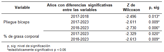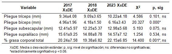 Las diferencias del pliegue del bíceps fueron significativas entre los 3 periodos evaluados. El aumento del porcentaje de grasa corporal total en 2023 fue significativo en comparación con los 2 años previamente analizados: 2017 y 2018.