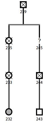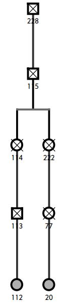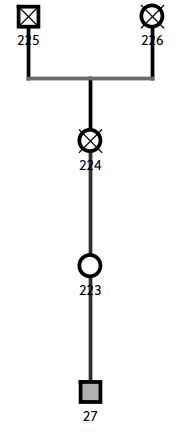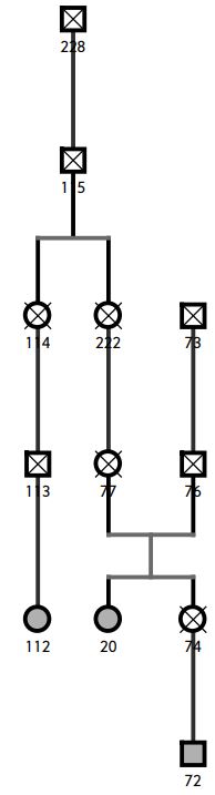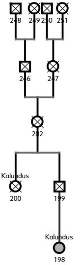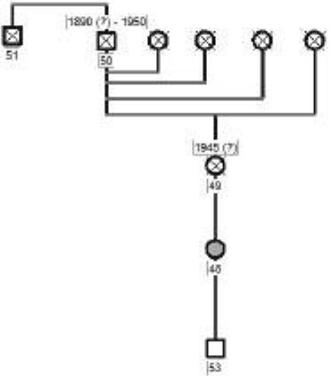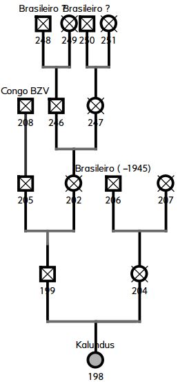 Tanto o avô materno (MF [206]), quanto o(s) avô(s) da avó paterna (FMFF [248] ou FMMF [250]) seriam brasileiros. Mas o(s) avô(s)[71] brasileiros da avó paterna seriam “brasileiros do norte, marrons”. Pedro é o nome do espírito da Tia Idalina. Ele vem do norte de Angola e fala quicongo. Como viria do Brasil? Esta explicação tinha me deixado um tanto confusa. O que acontecia era que, na sua explicação, Tia Idalina parecia misturar genealogia e genealogia espiritual. Tia Idalina atribuía aos trisavôs propriedade dos espíritos (o nome, no caso, Pedro, e a origem) e falava dos espíritos como de trisavôs. No discurso de Tia Idalina, os espíritos eram parte da genealogia ascendente. Mas não se tratava de confusão: os espíritos eram ancestrais remotos, eram trisavôs. Pedro era o trisavô, virado espírito, que atuava na trineta. O trisavô Pedro, hoje espírito, era um escravo do norte de Angola, que foi marrom no Brasil que (depois da morte?), teria voltado para Angola. A sua alma teria procurado, até encontrar a Tia Idalina, sua trineta, para ser ritualmente transformado em espírito.