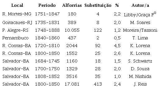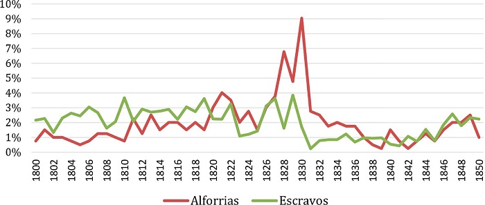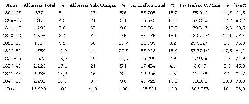 Não havia uma flutuação sempre equivalente entre volume do tráfico, o das alforrias em geral e, especificamente, daquelas por substituição. Assim, nos primeiros dez anos do século XIX foram desembarcados na Bahia 26,2% dos africanos, mas registradas apenas 9,9% das alforrias em geral e 10,8% daquelas por substituição. Em outros períodos, o tráfico se reduz drasticamente, como logo após a proibição de 1831, mas na mesma época as alforrias se mantêm num patamar razoável. A grande discrepância se dá no quinquênio 1826-1830, quando ocorre um volume de alforrias por substituição em proporção (27,8%) muito superior à do tráfico (13,9%).