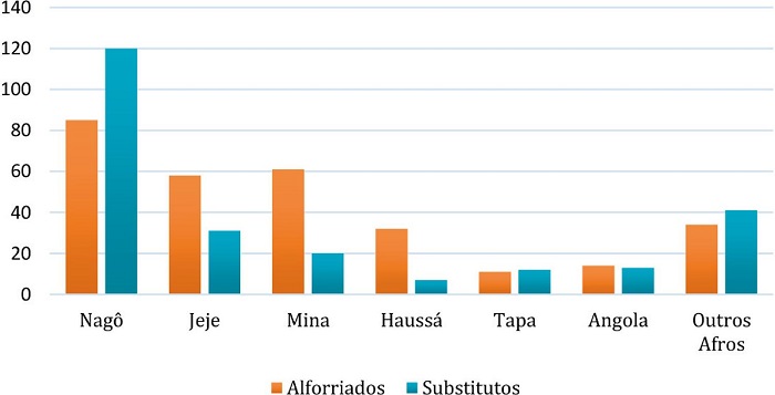 Em 33% das alforrias, libertos e substitutos pertenciam à mesma nação. Ou seja, nagô se trocou por nagô, jeje por jeje, haussá por haussá, mina por mina, e assim por diante. Entre os nagôs, essa proporção alcançou 56%, e no caso das mulheres o índice sobe para 61%. Os interessados em comprar cativos, para qualquer finalidade, estavam limitados pelo que o mercado oferecia, e nessa época eram sobretudo mulheres e homens nagôs que estavam disponíveis à venda. Ou seja, se uma nagô decidisse se alforriar por troca ela teria, quase inevitavelmente, que obter alguém de sua própria nação para substituí-la. Da mesma forma, os libertos de outras nações africanas, além dos brasileiros, entregaram como moeda de troca cativos nagôs na sua maioria. Dos 44 jejes para os quais conhecemos a origem de seus substitutos, apenas 27,3% se trocaram por outros jejes; dos 19 haussás, apenas um se trocou por outro haussá.
