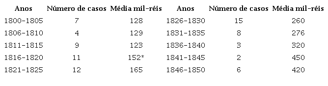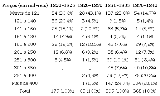 Confirmariam essa impressão os inventários post-mortem abertos entre 1820 e 1830 ( Tabela 4 ). O valor médio de uma escrava baixou de 279 para 235 mil-réis, queda de 19%, e o de um escravo, de 347 para 290 mil-réis, queda um pouco maior.21 A proporção de cativos mais baratos (menos de 121 mil-réis) era 30,6%, em 1820-1825 e pulou para 43,5%, em 1826-1830, alta de 13%. Nas duas décadas seguintes à proibição de 1831, quando prevaleceu o contrabando, os preços aumentariam seriamente. Nos inventários feitos antes de 1831, encontrei apenas um escravo (equivalente a 1,5%) avaliado em mais de 400 mil-réis; após essa data, mais de duzentos (24,7%).