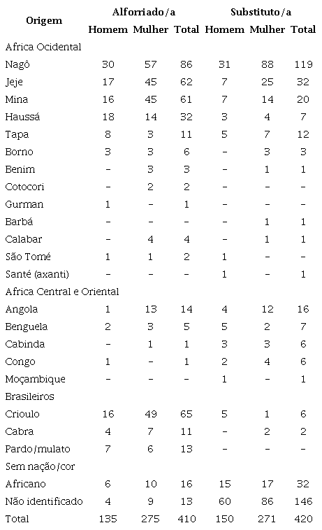 A tabela expressa como a rota do tráfico se refletiu no perfil dos alforriados e seus substitutos. Além da origem na África e da cor dos nascidos no Brasil, ela traz a distribuição por gênero dos envolvidos.
