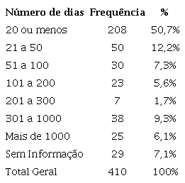 Indício disso está representado na Tabela 6 , que conta o tempo decorrido entre a redação da carta de alforria pelo senhor e seu registro em tabelião pelo liberto. Presume-se que, muita vez, o intervalo entre um e outro ato fosse o necessário para que se cumprissem as condições para efetivar a alforria, e nesse caso, que fosse entregue um escravo “a contento”, como se lê em diversos desses documentos. O senhor devia, inclusive, reter o papel de liberdade durante a transição. Contudo, em mais da metade das cartas para as quais temos informação, o período decorrido entre concessão e registro foi curto, vinte ou menos dias. Consideradas aquelas registradas em até 100 dias, chegamos a 70,2%. Mas não se deve tomar data de redação da carta como fatalmente próxima da data de aquisição do substituto pelo forro, pois amiúde teria sido adquirido havia mais tempo, com frequência anos antes.