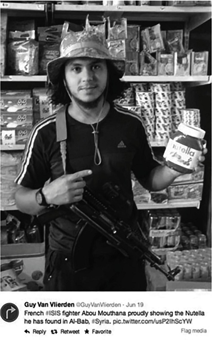 Na imagem, o jihadista Abu Muthanna, kunya de Nasser Ahmed Muthana, um britânico que atuou no Estado Islâmico como recrutador on-line, aparece junto a uma metralhadora e com a barba sem aparar. 86 Essas características são indícios de sua atuação na jihad . Ao mesmo tempo, a camiseta da Adidas, o pote de creme de avelã Nutella e a foto no Twitter são indícios da hibridação. A ironia, ao menos para o público brasileiro, é que o termo “Nutella” é utilizado nas redes sociais para se referir às gerações que supostamente perderam a essência, ao contrário da “geração raiz”, formada por pessoas autênticas e que conheceram um passado melhor que o presente.