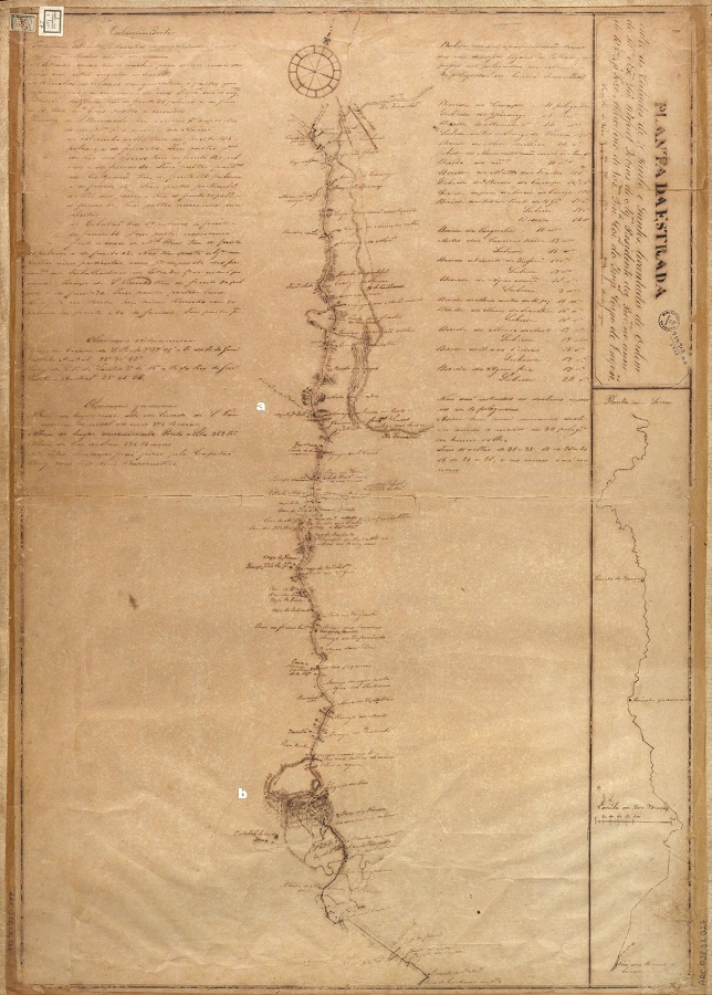 Essa fonte cartográfica nos interessa devido a esses pormenores. Por intermédio deles foi possível identificar alguns locais mencionados nos ofícios sobre o quilombo no Cubatão, o que outros mapas consultados não mostram. A “Entrada de Sto. Amaro” (a) e a “Cachoeira do Rio das Pedras” (b), ambos à esquerda do caminho principal, marcam os limites dentro dos quais tal agrupamento deveria se situar, de acordo com os primeiros relatos das autoridades. A “entrada”, a noroeste, compreendia um braço de acesso à capital. Já a “cachoeira”, ao sudoeste, era o ponto mais próximo do povoado do Cubatão, no pé da serra.50