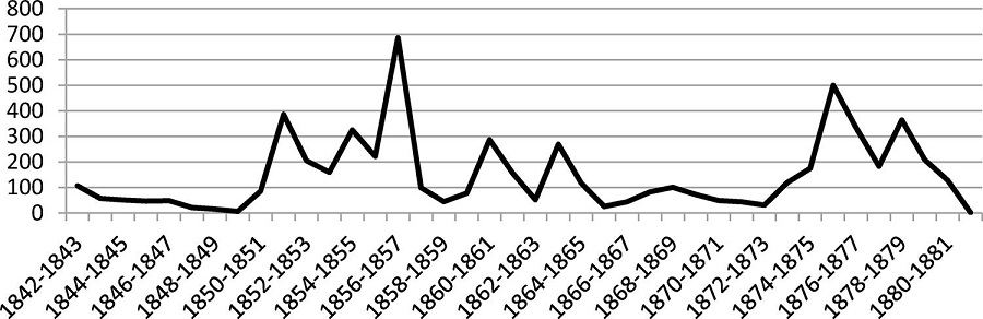 O Gráfico 1 expõe o volume anualizado das exportações de escravos de Alagoas. No total, foram exportados legalmente, pelos portos do Jaraguá, Penedo e outros entrepostos menores na província, 6.410 escravos entre 1842 e 1882.