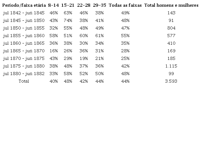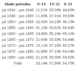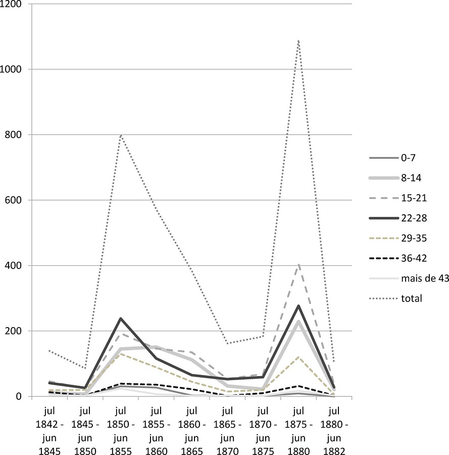 Pode-se observar que, enquanto o comércio interprovincial era de pequeno volume nos anos de 1840, a proporção de menores de 22 anos manteve-se a mais baixa da série. Na medida em que houve intensificação dos negócios, ocorreu um aumento progressivo dessa faixa, chegando ao ápice no quinquênio 1860-1865. Após uma leve regressão nos quinquênios seguintes, essa proporção tornou a crescer em 1875-1880, mantendo-se estável nos dois últimos anos da série.