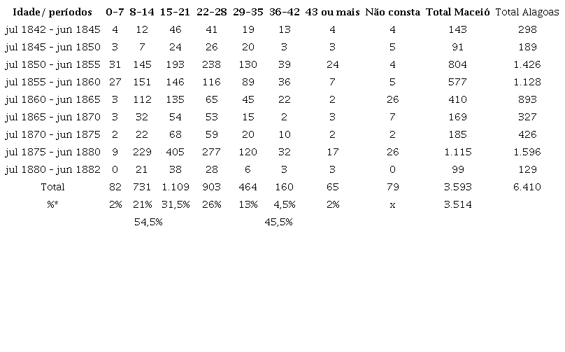 Ou seja, há diversos fatores que incidiram sobre o registro da idade de um escravo (bem como da população livre pobre) e sobre a produção das fontes.38 Serão feitas breves considerações sobre alguns deles na medida em que sejam pertinentes na análise dos dados; mas, de um modo geral, é preciso encarar a impossibilidade de corrigir esses desvios e trabalhar com a idade nos passaportes como um conjunto consistente de informações, no qual a variação da marcação dos anos de vida em relação à realidade não influi substancialmente sobre os principais pontos que caracterizavam o perfil dos escravizados exportados de Maceió. Ou seja, parte-se do pressuposto de que há discordâncias entre os anos de vida de um escravo e o modo como essa informação foi registrada na fonte. No entanto, embora essa circunstância possa provocar algumas variações entre a proporção de cada faixa etária específica, ela não afeta as conclusões gerais obtidas sobre esses dados.