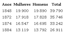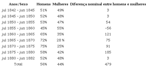 O quadro revela que havia equilíbrio entre os sexos da população escravizada ao longo do período em análise. Por um lado, essa constatação indica que a densidade de homens e mulheres cativos na província não teria afetado sua maior ou menor incidência nos negócios interprovinciais. Por outro, aponta que esse negócio não impactou significativamente a relação entre os sexos ali. O quadro abaixo contribuiu para essas observações: