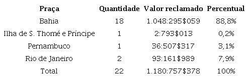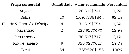A tabela demonstra que o pleito dos baianos era superior à soma das reclamações dos comerciantes de todas as outras praças juntas e corres- pondia a três vezes o valor reivindicado pelos do Rio de Janeiro, segunda praça mais afetada. Essa diferença expressiva resultava do fato de a Costa da Mina ser, desde longa data, o lugar preferencial do comércio negreiro baiano, associado ao impreciso entendimento dos limites de tal região por parte dos oficiais ingleses. 10 O conflito de entendimentos resultava na ambígua, indefinida e confusa interpretação aplicada ao artigo X do tratado anglo-português, que provocou “demoradas controvérsias a respeito das capturas lícitas ou ilícitas de navios negreiros com bandeira portuguesa”. 11