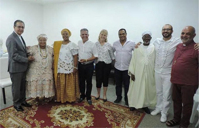 Não vou mentir para você que isso é o que tem me ajudado muito. A gente tem que agradecer a Deus por isso. A gente tem união aqui, com Candomblé, com judeus, pastores e padres. Se você olha bem o que a gente está estudando, fazendo aqui, é igual a jogo de futebol. Os times do Bahia e Vitória querem fazer gol para ficarem felizes, então cristãos, povo de Candomblé, a gente quer fazer o bem, diante de Deus e do que é sagrado para nós, fazer coisas boas. A maneira como um muçulmano conversa com Ele, com o Criador, pode não ser a maneira como os cristãos conversam com ele. Muçulmanos oram cinco vezes ao dia, todas as religiões têm orações; muçulmanos falam sobre a fé, todas as religiões falam sobre a fé; muçulmanos têm jejum, quase todas as religiões têm jejum, ou especificidades alimentares. Outras religiões podem não funcionar da mesma maneira, mas fazem caridade. As maneiras de fazer podem ser diferentes, mas o objetivo é o mesmo. Você não vai ver pregação para destruição em nenhuma religião. Todas pregam a solidariedade, a caridade, cuidar da família; o objetivo é o mesmo, só a maneira de chegar a Deus [é] que pode ser diferente. Para mim, isso é fácil. Eu tenho boas relações e diálogo com muitos líderes religiosos, com o Padre Jonathan,48 com Jaciara,49 nossa mãe Makota,50 me dava muito com o pastor Djalma Torres,51 agora falecido. A gente usa o auditório de José Medrado52 para fazer reuniões anuais; também, junto com o Ministério Público, fazemos palestras lá juntos. E isso é uma coisa bem única na Bahia, reflete essa herança nossa, porque no resto do Brasil não é a mesma coisa. Aqui cada um fala dos assuntos de acordo com a sua religião. A maneira como a gente está trabalhando com outras religiões é o futuro.