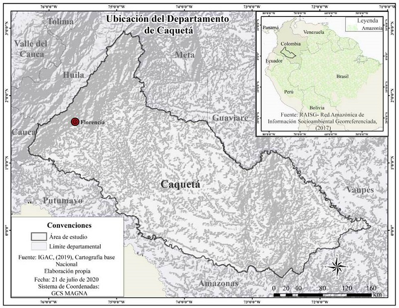 El departamento de Caquetá hace parte de la cuenca hidrográfica del río Amazonas, se encuentra en la zona transicional del sistema Andes-Amazonía y es un escenario ecológico con características especiales por ser la zona donde interactúan los ecosistemas montañosos de los Andes y la selva húmeda tropical amazónica en Colombia (Clerici et al., 2019; Comisión Económica para América Latina y el Caribe [CEPAL] & Patrimonio Natural, 2013). Sin embargo, este departamento ha sido protagonista de distintas olas extractivistas y dinámicas productivas que han modelado el paisaje actual (Ciro-Rodríguez, 2018), entre otras, la extracción de quina a finales del siglo XIX, del caucho a principios del siglo XX, luego, en los años treinta, la ganadería y a finales de los años setenta los cultivos de coca. En los últimos 40 años se ha incrementado la presión antrópica por la expansión agropecuaria, traducida en el agotamiento y la contaminación de recursos naturales, la pérdida acelerada de biodiversidad, la erosión, la degradación del suelo y la deforestación (Clerici et al., 2019).