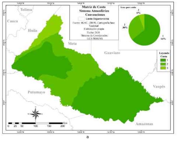 Para el sistema atmosférico se identificaron precipitaciones entre 1.000 y 4.000 mm anuales, donde la mejor valoración en la escala de costo es para las zonas con mayor magnitud, ya que estas magnitudes en la región favorecen el alto movimiento de flujos, ya sea transitando por los suelos, compensando el consumo elevado de la vegetación o contribuyendo a la recarga de acuíferos. Alrededor del 64% del departamento presenta un costo de 1, mientras que los costos de 2 y 3 corresponden al 36% restante.