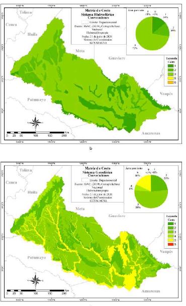 En el sistema hidrosférico se reunieron los cuerpos de agua superficiales y las zonas potenciales de recarga y se obtuvo como resultado una matriz conjunta con costos entre 1 y 6. Se aprecia cómo las zonas con el menor costo están en inmediaciones de la serranías de Chiribiquete y de Araracuara, donde el costo 3 tiene la mayor cobertura, con casi el 53% del área de estudio, mientras que costos más altos (5 y 6) corresponden a los flujos relacionados con los cuerpos de agua contaminados con aguas residuales o metales pesados; sin embargo, estos últimos ocupan menos del 1% del área total del departamento, lo cual da a entender que en términos del sistema hidrosférico se tiene un alto movimiento de flujos.