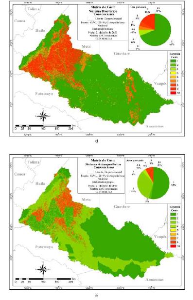 El sistema biosférico junto con el sistema antroposférico, dada su dinámica, son los que contienen valores dentro de los cuatro rangos de la escala. En el biosférico, las zonas con costos de 8 a 10 cubren el 21% del departamento y las que presentan costos de 4 a 7 abarcan un poco menos del 10%. Sin embargo, aun cuando resalta el área donde la propagación de flujos, en este caso, de las especies focales, se ve limitada, en la mayor parte (69%) del departamento estas no se ve afectadas.