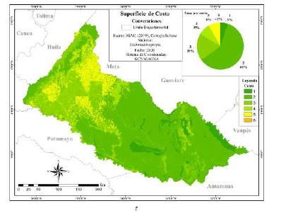 Cada una de las actividades mencionadas genera demanda del suelo y por ello la Unidad de Planificación Rural Agropecuaria (UPRA, 2014) tiene en cuenta la vocación de este. Basándose en esto, se relacionaron únicamente las coberturas intervenidas por el ser humano con la vocación del suelo, información que fue obtenida de los Mapas de Clasificación de las Tierras por su Vocación de Uso a escala 1:100.000 elaborados por el IGAC (2017), donde se especifica que el objetivo principal de la vocación es la determinación del uso más apropiado que puede soportar cada suelo, buscando una producción que no deteriore los recursos naturales. Este insumo contiene un atributo referente al uso principal recomendado desde el punto de vista del desarrollo sostenible y fue usado para realizar la comparación (IGAC, 2013). La asignación de costos se realizó de la siguiente manera: costo de 1 para aquellas coberturas que por su actividad coincidieran con la vocación del suelo y luego, para aquellas coberturas que no tuviesen coincidencia, se les calificó según la categorización por niveles del estado de conservación de los suelos propuesta por el Instituto SINCHI para los suelos de la Amazonía (Peña-Venegas & Cardona, 2010).