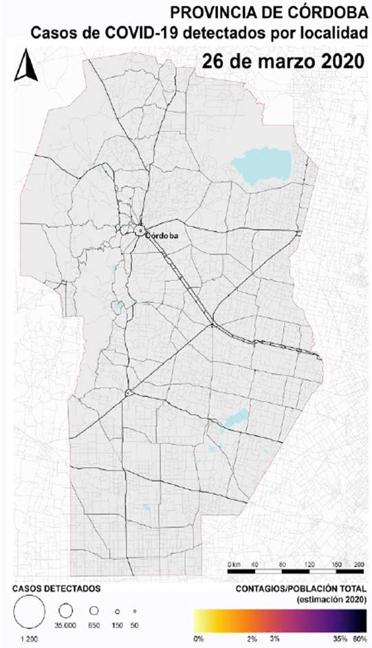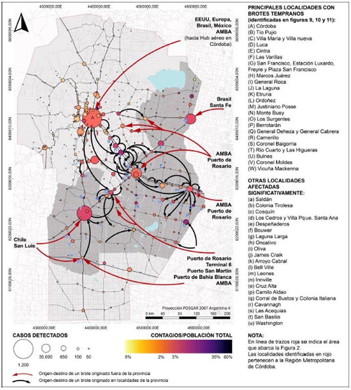 Sin embargo, el principal nodo regional de la red de transporte nacional es realmente la RMCba; pero el impacto allí tampoco tuvo una magnitud semejante, incluso considerando su mayor población y densidad de ocupación (más de 600 hab./ha en el área central de Córdoba, contra los menos de 26 hab./ha medios de la región pampeana). Los resultados obtenidos permiten inferir que mientras que la escala y densidad de la RMCba supusieron considerarla un área de alto riesgo (lo que conduce a que técnicos y ciudadanos aumenten las medidas de precaución), las prácticas cotidianas en la región pampeana tienden a percibirse disociadas de "aquellas de las grandes ciudades" que suponen mayores riesgos de contagio.