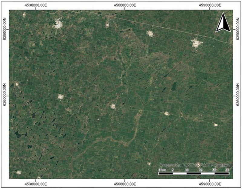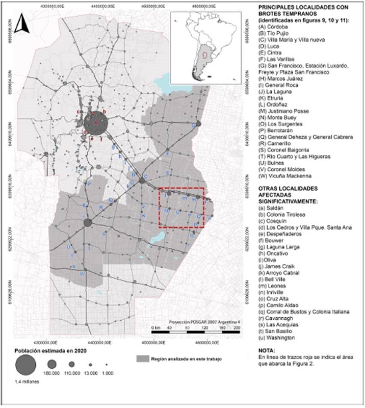 La región está ubicada en el este y el sur de la provincia de Córdoba (Figura 1), en la zona central de Argentina, abarcando (aproximadamente) los departamentos General San Martín, Juárez Celman, Marcos Juárez, Río Cuarto, San Justo y Unión. Su población reside en pequeñas localidades dispersas en un paisaje ocupado casi totalmente por campos agrícolas (Figura 2), con unos pocos aglomerados urbanos de mayor tamaño, como Río Cuarto (casi 176.000 habitantes), la conurbación Villa María-Villa Nueva (algo más de 110.000 habitantes) y San Francisco (68.800 habitantes)3.