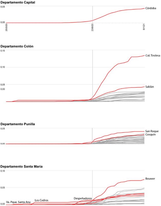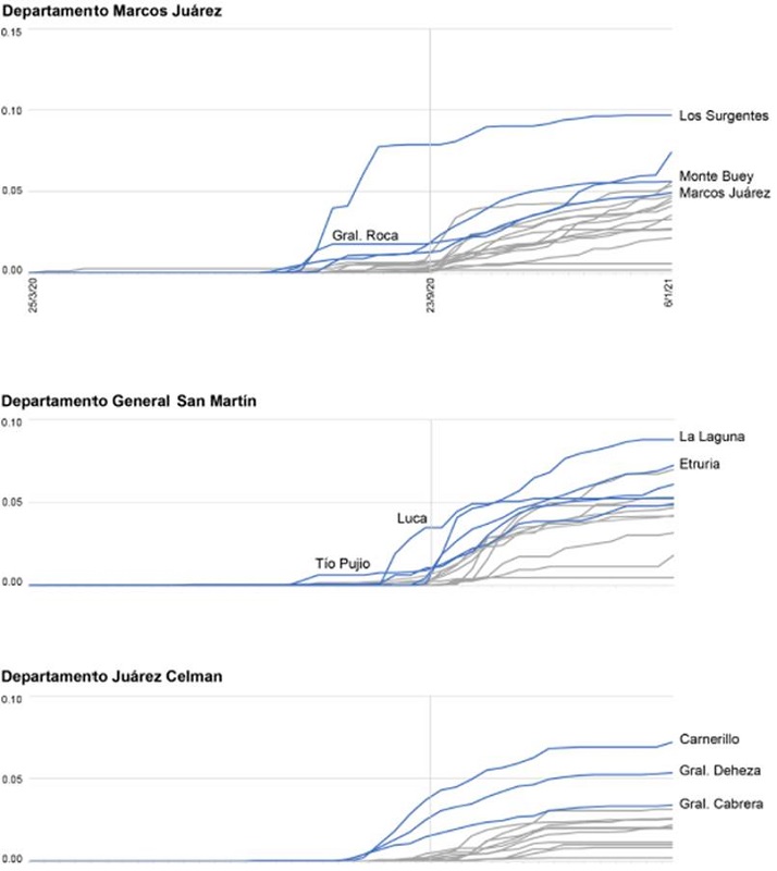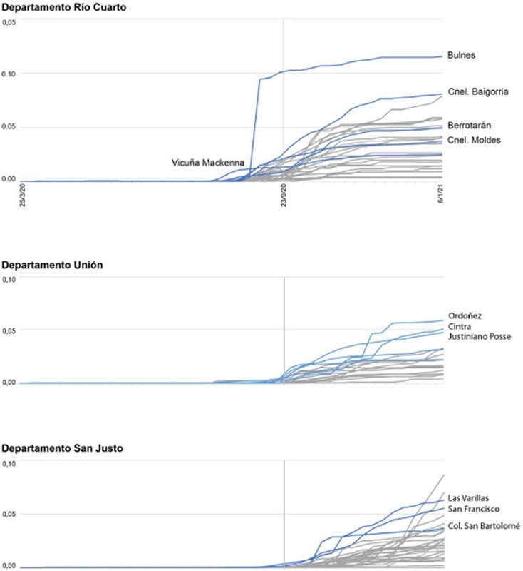 Este fenómeno es más evidente cuando se analizan los casos acumulados durante 2020 desagregados por localidad. Las Figuras 9, 10 y 11 muestran, para cada departamento, las localidades con los brotes de contagio más intensos y tempranos (en rojo para la RMCba y en azul para la región estudiada). En el período correspondiente al ASPO, los gráficos muestran claramente los brotes de contagio tempranos que pudieron ser controlados. Pero a partir del 23 de septiembre de 2020, cuando en la ciudad de Córdoba comienza un marcado aumento en la velocidad de contagios, en los departamentos de la región pampeana ya existían numerosas localidades con tasas de contagio mayores en brotes originados varias semanas antes. Además, al calcular los casos en relación con el tamaño de la población en cada localidad, los gráficos revelan la mayor intensidad de contagios en la región estudiada, incluso en comparación con los de la RMCba. En Bulnes, por ejemplo, en menos de 10 días se contagió todo el personal sanitario y de la administración del gobierno local (unas 82 personas) y se decretó circulación comunitaria del virus el 2 de septiembre de 2020 (Ferreras, 2020; Redacción La Voz, 2020).